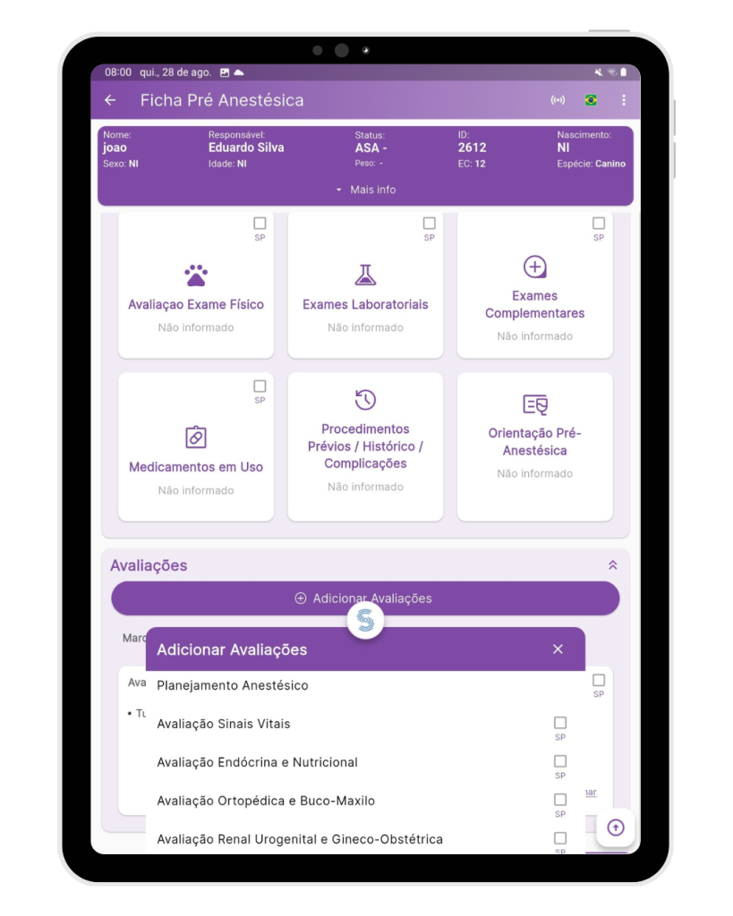 Pré-anestésica completa: histórico, ASA, riscos, alergias e checklist, tudo em dados estruturados.